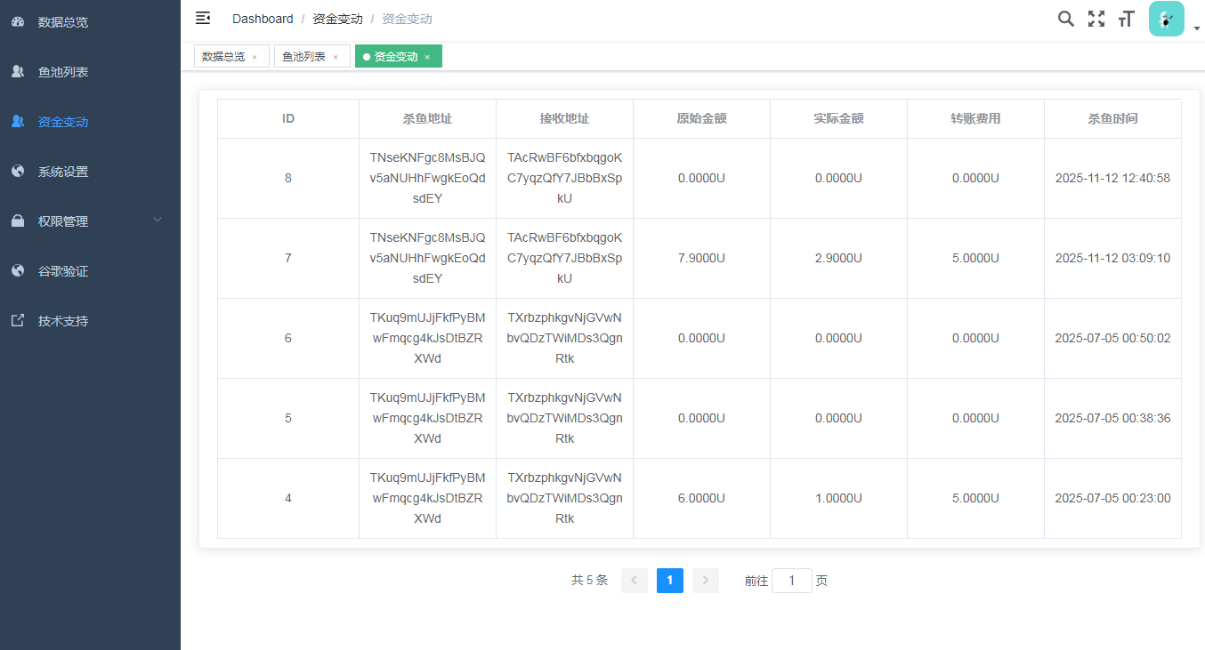 后台直接看到授权鱼苗地址,可直接杀鱼,杀鱼自动把对方usdt钱包的u转到自己的钱包地址上