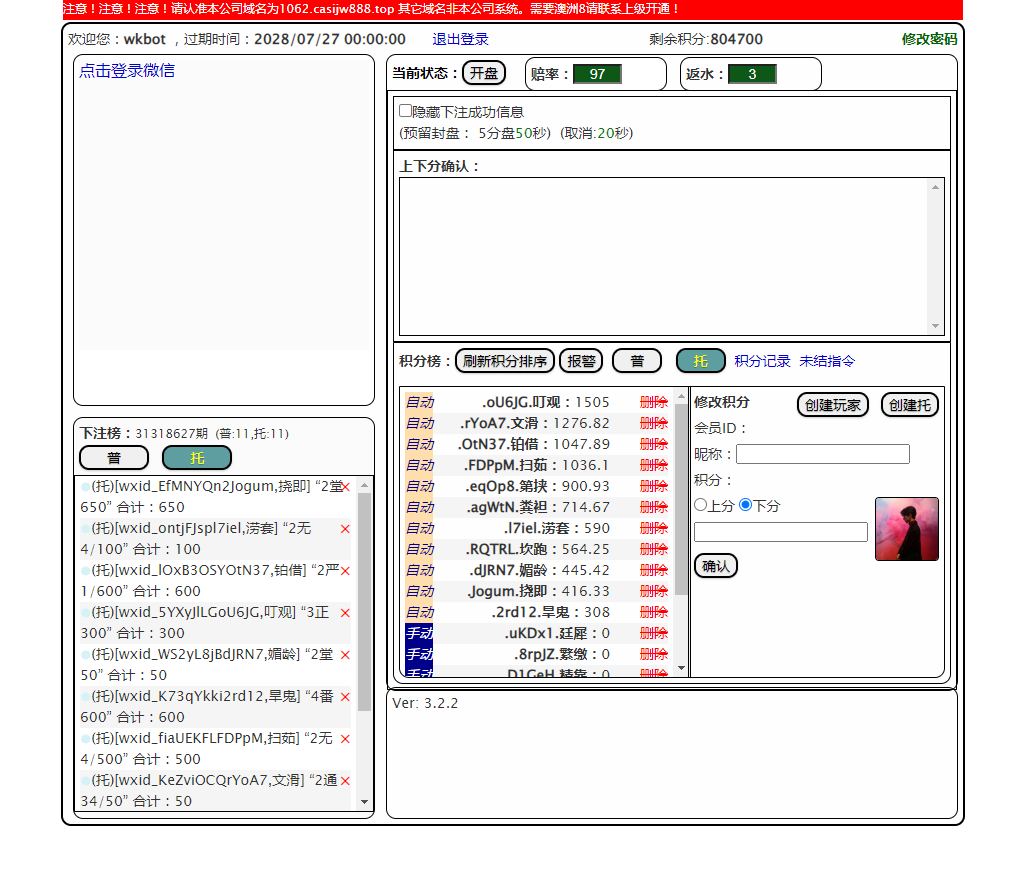 开奖对接的是168,可以正常采集开奖结算,测试除了功能单一其他也还行,总后台没有开下级代理账户的地方,前端需要在机器人后台创建玩家后复制对应链接才可以进入