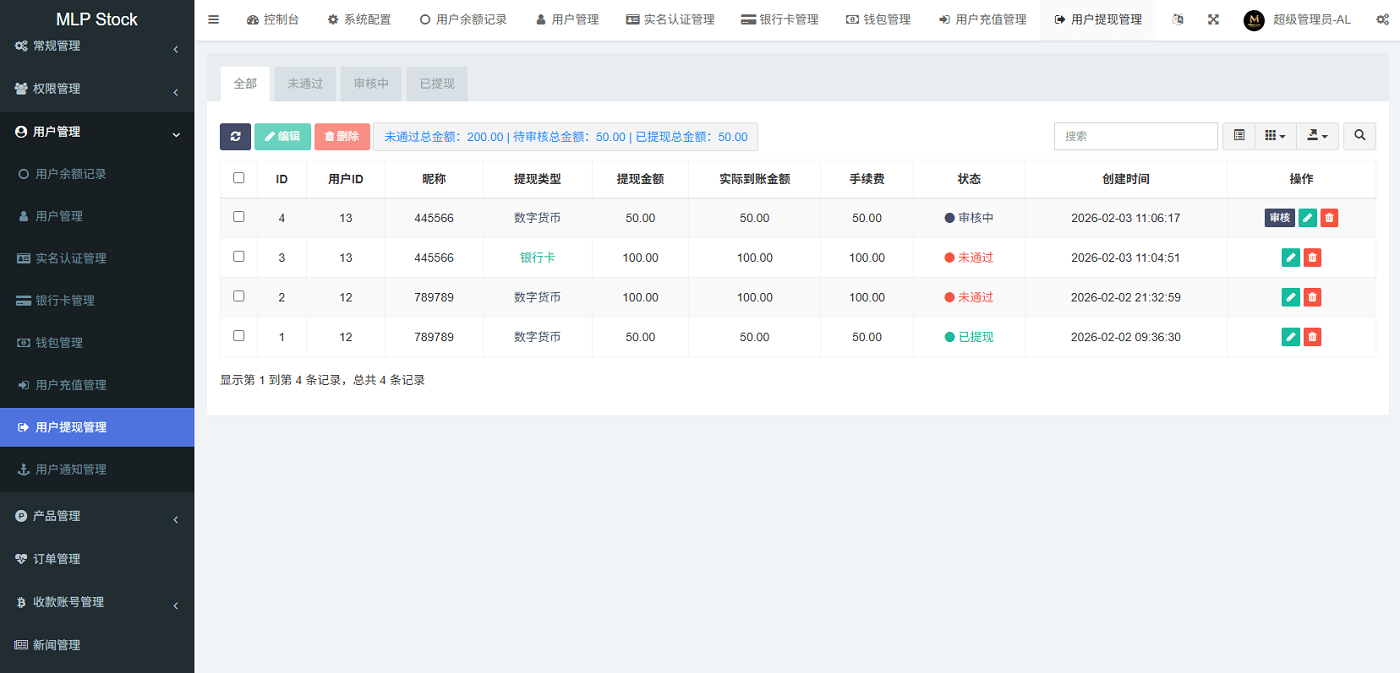系统功能:信用分,实名认证,银行卡usdt充值提现,用户单控,订单控制等功能